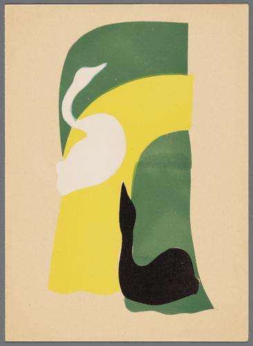 Twee afbeeldingen. Kaft: Twee gestileerde zwanen in wit en zwart tegen groene en gele vlakken. Tweede blad: geel en groene abstracte vorm met titel.