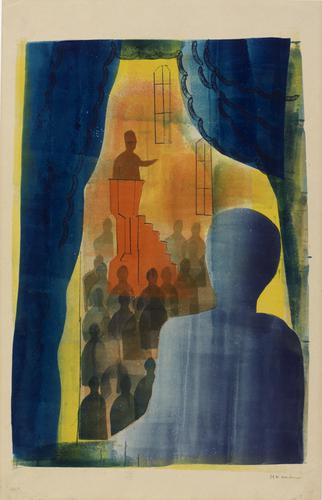 Illustratie: een kerk met een priester op een preekstoel, onder hem een groep luisterende mensen. Op de voorgrond een figuur die door een deur met blauwe gordijnen omlijst, het tafereel aanschouwt.