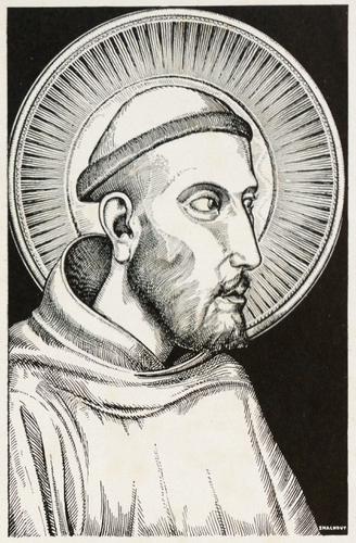 Portret van Franciscus van Assisi en 3/4 naar rechts. in pij met wijde kraag, met tonsuur en kleine baard en snor. met aureool. zwarte achtergrond vormt kader.