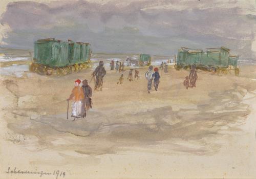 Strand van Scheveningen met wandelende mensen en omkleedkarren langs de waterlijn.