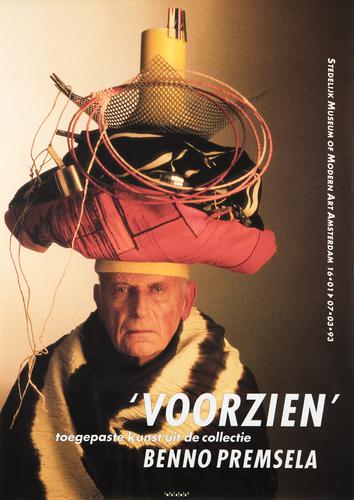 Het affiche bestaat uit een foto (kleur) van Benno Premsela (portret) met een hoofddeksel op bestaande uit verschillende onderdelen (kunst voorwerpen). Tekst in witte letters.