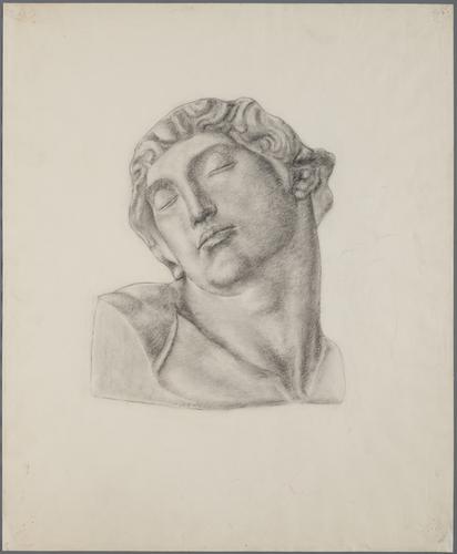 Voorstudie van een in klassieke stijl gebeeldhouwd hoofd, dat schuin naar links, en achterover is gebogen. Op de achterkant is een ruwe schets aangebracht van een zittend vrouwelijk naakt.