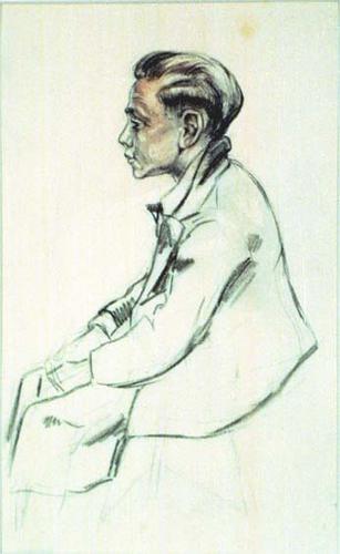 Jongen en profile naar links, zittend op kruk, achterover gekamd haar en scheiding, handen in de schoot.
