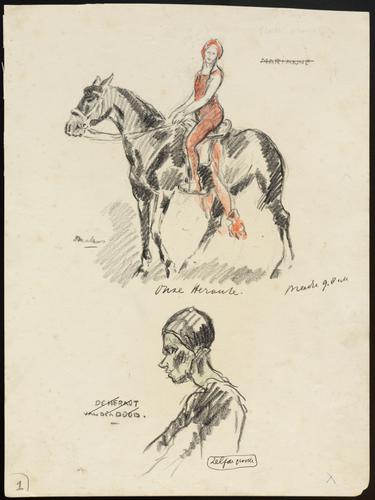 Vrouw en trois quarts naar links op een paard, gekleed in een rood nauwsluitend pak zonder mouwen, met vlechten in het haar (b.), en een groene vrouwenkop en profile naar links met een zwart kapje op het hoofd (o.)