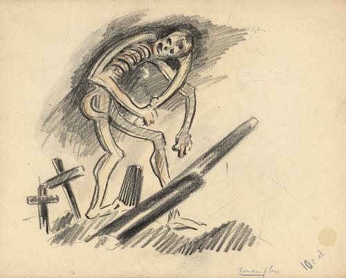 Een skelet, voorstellend de dood, en trois quarts naar rechts, met in de linkerarm een kromzwaard, staande op een slagveld met twee kruizen links achter en twee kanonnen (?) voor hem.