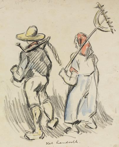 Boer en boerin en trois quarts naar links van achter, boer met gele strooien hoed, blauw hemd en gele kniekousen met zeis over de rechterschouder. Boerin met blauwe jurk en rode hoofddoek met houten hooivork over de linkerschouder.