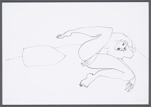 Irma liggend op haar zij op een bed, naakt, heeft haar knieen op getrokken en een hand tussen haar benen. Ze heeft haar mond open Links ligt een kussen.
