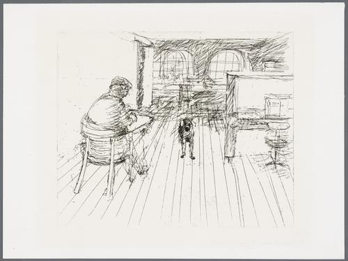 Interieur met planken vloer met man, gezien op de rug, zittend op een stoel aan een tafel. In het midden staat de hond Floortje en face. Rechts staat een piano met muziek en een kruk. Op de achtergrond twee boogramen.