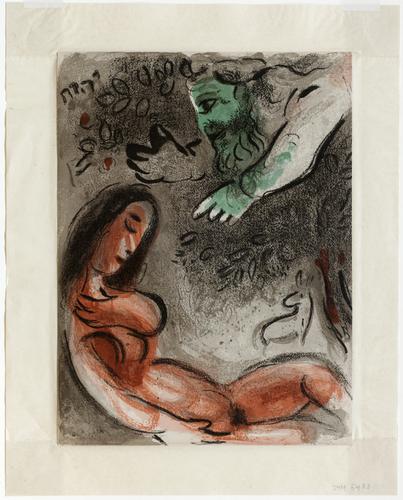 De achteroverliggende Eva wordt door God toegesproken. Verso slang (Mourlot 259).