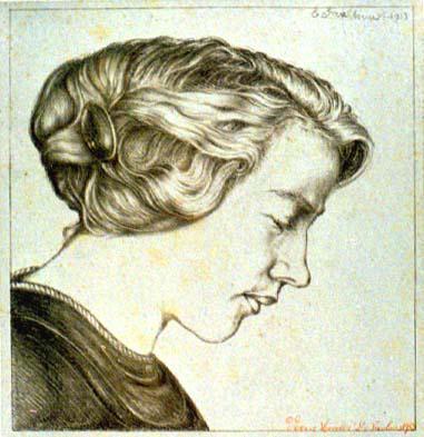 Schouderstuk van jonge vrouw en profiel naar rechts met opgestoken haar met ovale haarspeld, licht naar beneden gebogen hoofd en naar beneden geslagen ogen.