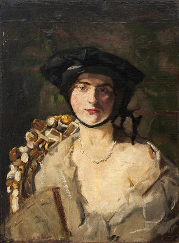 Portret van een jonge vrouw, borstbeeld en face. Ze draagt een zwarte hoed met band om de kin en een parelketting om de hals. De rugleuning van de rieten stoel is achter haar te zien.