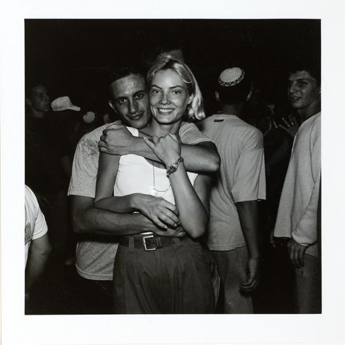 Een jongen houdt een meisje vast. Beiden glimlachen. Op de achtergrond meerdere mensen.
