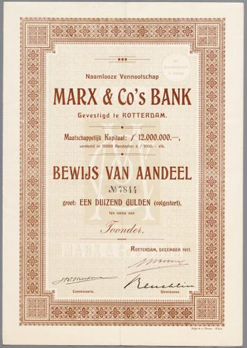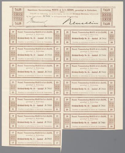 Aandeelbewijs van de N.V. Marx & Co's Bank, met los bijgevoegd dertien dividendbewijzen en een talon.