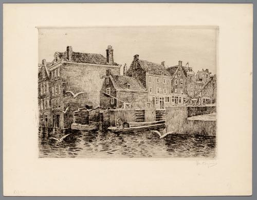 Stadsgezicht; sluis waar zojuist een praam door gaat. Op de achtergrond oude huizen