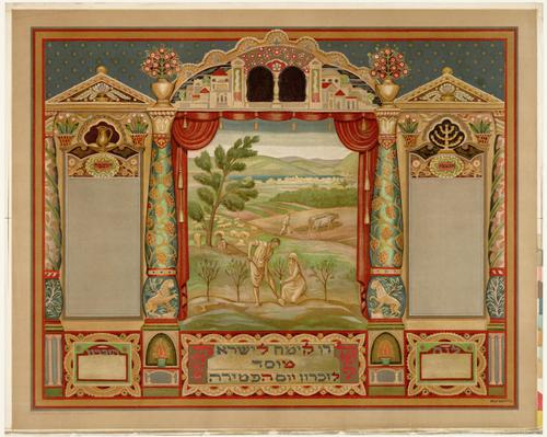 Ontwerp voor boomcertificaat met decoratie van zuilen, timpanen waarboven een sterrenhemel. In het midden een landschap met bergen en een stad op de achtergrond. Op de voorgrond een echtpaar dat bomen plant. Daaronder een cartouche met hebreeuwse tekst.