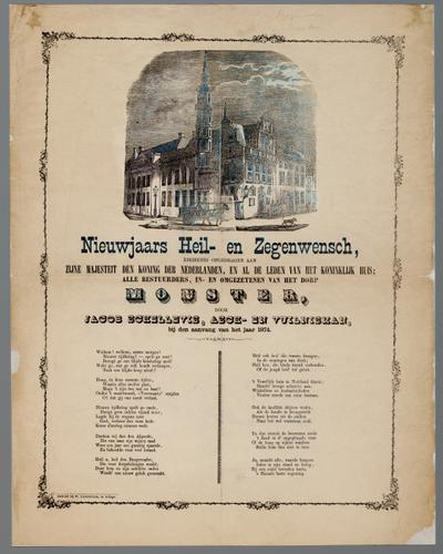 Straatgezicht met voorbijrijdende vuilniskar met op de achtergrond een straathoek met huizen en een gebouw met toren. Daaronder een gedicht.