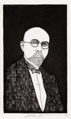 a: busteportret en profil naar rechts van J.I. de Haan met keppeltje en pince-nez, b: portret van J.I. de Haan demi naar rechts gedraaid met wit overhemd, strikje, bril en keppeltje.
