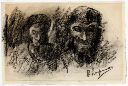 Bustepotret van man met neergeslagen ogen en hoofdbedekking, rechts portret van man met hoofdbedekking en baard.