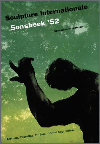 Reproductie van foto, getiteld: 'Burgers van Calais' van Rodin door Eva Besnyo in sillouette op reproductie van foto met bomen. Zwarte afbeelding op groen. Tekst in zwarte, witte, groene en bruine letters.