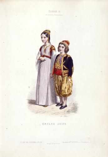 Ingekleurde afbeelding van twee staande kinderen iets naar links gedraaid, ten voete uit afgebeeld. Het meisje (links) draagt een wit-paars gestreepte lange jurk, het jongetje (rechts) een okergele pofbroek met bloemen en een paars met geel jasje. Beide hebben een hoofddeksel.