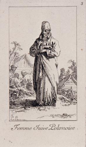 Omkaderde frontale voorstelling van een staande vrouw in een landschap met op de achtergrond enkele zittende mannen en twee daken van huisjes.