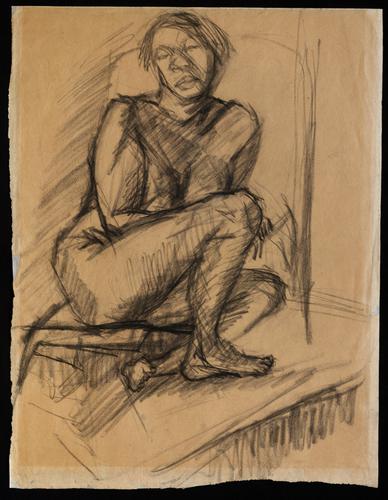 Naaktportret van een zittende vrouw en face, met opgetrokken benen.