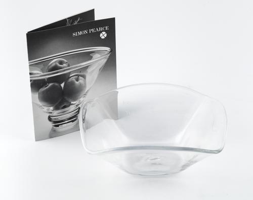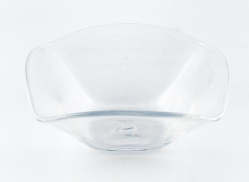 Glazen schaaltje met vier naar boven wijd uitlopende zijden en rondlopende bovenrand. In de bodem een klavertje vier.