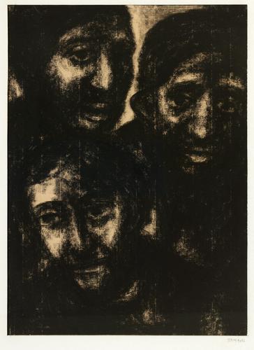 Drie mannen. Eén man op de voorgrond, de twee anderen daarachter, allen en face en enigszins schuin wegkijkend afgebeeld.