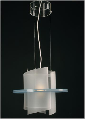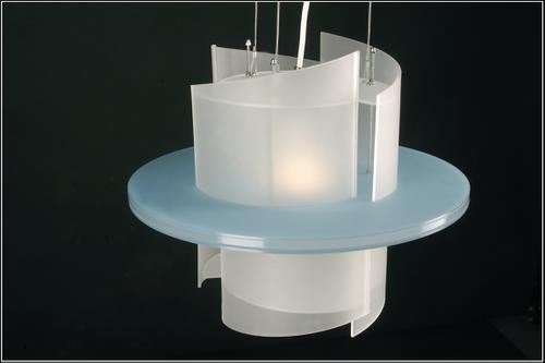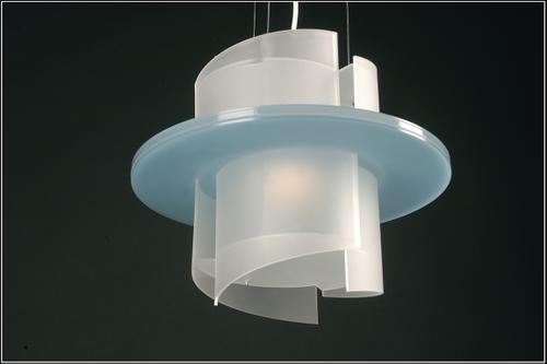 Cylindervormige hanglamp van gematteerde verticale perspex segmenten die verspringend rond een schoepvormig middendeel zijn geplaatst. De lamp is in het midden in tweeën gedeeld door een horizontale uitstekende blauwe schijf.