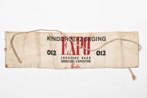 Witte armband met twee touwtjes en opschrift in zwarte en rode letters.