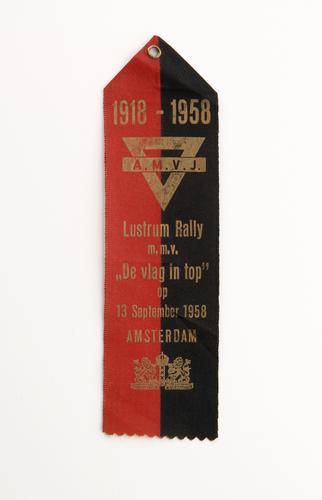 Rechthoekig rood-zwart vaantje, aan de bovenkant uitlopend in een punt en aan de onderzijde een kartelrand. Op de voorzijde het logo van de AMVJ en het wapen van Amsterdam. Goudkleurige opdruk.