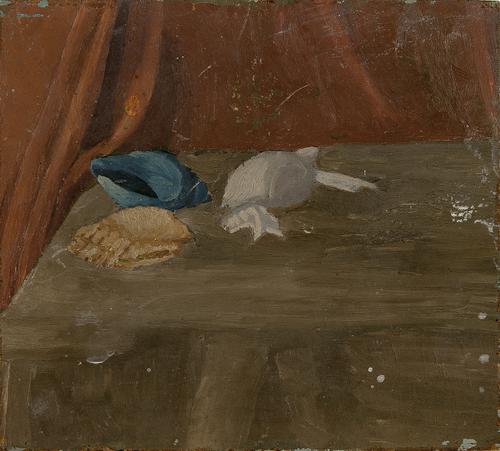 Stilleven met vier schelpen op een tafel met een bruin tafelkleed. Op de achtergrond een bruin/rood kleed gedrapeerd.