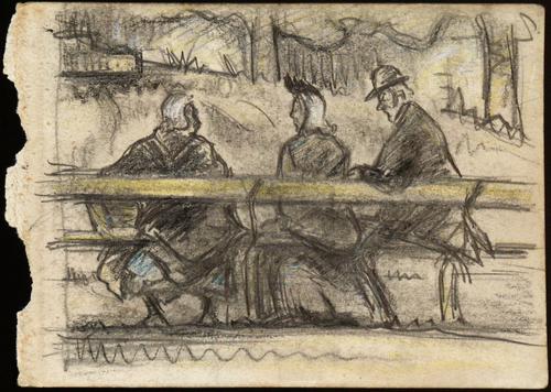 Drie mensen van achter gezien op een geel bankje in een park. De man rechts heeft een bolhoed op en kijkt boos. Schetsmatig getekend.
