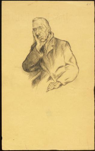 Tekening van een man tot zijn middel van voren gezien, al leunend op een tafel met zijn rechterhand zijn hoofd ondersteunend. De andere hand rust op zijn schoot. Hij draagt een lange, dichtgeknoopte overjas met daarin een sjaal. Het papier is geel van kleur.