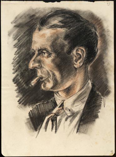 Tekening van een man en profil n.l. met achterovergekamd haar, een hemd, jasje en stropdas die een sigaar rookt. Er is veel schaduwwerking op zijn gezicht en de achtergrond is donker.