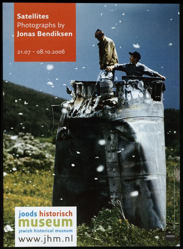 Aflopende foto waarop twee mannen tussen duizenden witte vlinders, in een fris groen landschap delen van een neergestort gedeelte van een raket demonteren. Daar overheen tekst in een rood en wit kader.