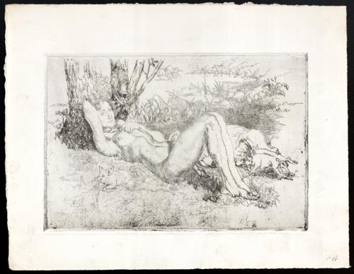 Vrouwelijk naakt, ten voeten uit liggend op de rug , en trois quart naar rechts, met een zogend varken op de achtergrond en een big op de voorgrond