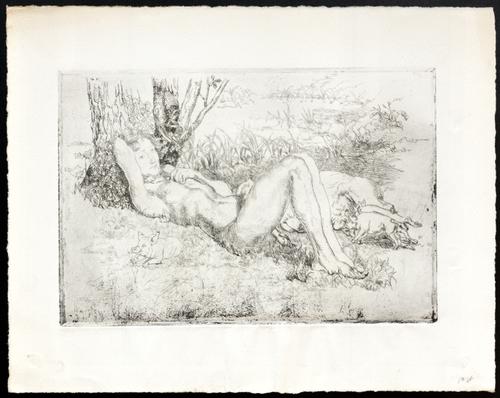 Vrouwelijk naakt, ten voeten uit liggend op de rug , en trois quart naar rechts, met een zogend varken op de achtergrond en een big op de voorgrond