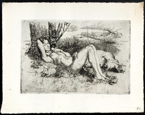 Vrouwelijk naakt, ten voeten uit liggend op de rug , en trois quart naar rechts, met een zogend varken op de achtergrond en een big op de voorgrond