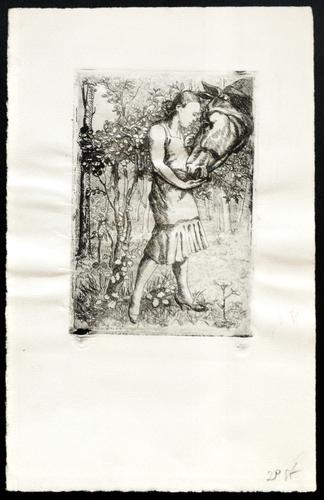 Jonge vrouw, ten voeten uit staande, en profil naar links, houdt paardenkop vast, en profil naar rechts. Op de achtergrond zijn bomen zichtbaar. Op de achterzijde is een halve schets van een grazend paard te zien.