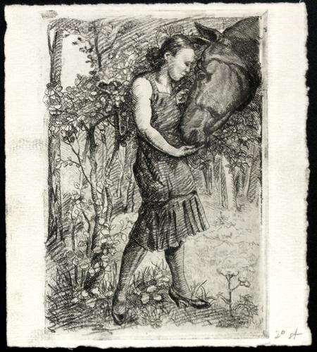 Jonge vrouw, ten voeten uit staande, en profil naar links, houdt paardenkop vast, en profil naar rechts. Op de achtergrond zijn bomen zichtbaar. Op de achterzijde is een halve schets van een grazend paard te zien.