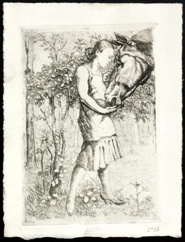 Jonge vrouw, ten voeten uit staande, en profil naar links, houdt paardenkop vast, en profil naar rechts. Op de achtergrond zijn bomen zichtbaar. Op de achterzijde is een halve schets van een grazend paard te zien.