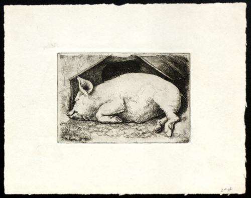 Slapend varken, op haar zij liggend, kop n.l., voor kot. Links op de achtergrond twee boompjes.