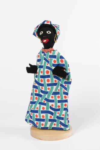 Pop voor een Poeriemspel; een Afrikaanse vrouw met kleurige kleding en hoofddoek