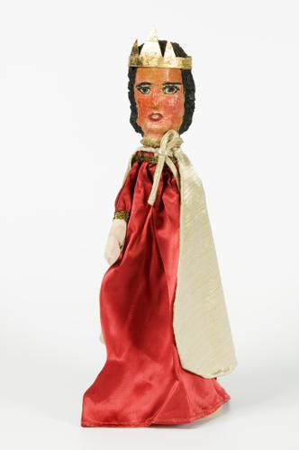 Pop voor een Poeriemspel; een vrouw met rode kledij en een 'gouden' mantel en een kroon; Koningin Ester