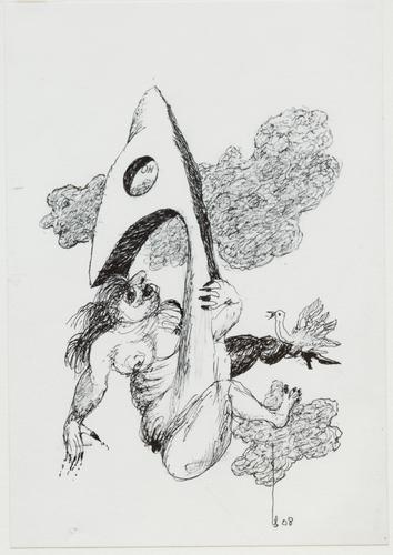 Zwevende, naakte vrouw mer een sculpuurachtige vorm, wolkjes en een vogel.