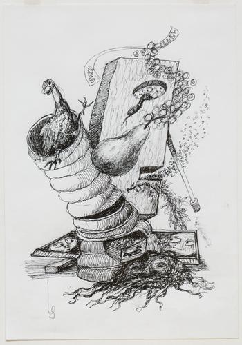 Stilleven; half abstracte vormen en objecten, en onder meer een vogel, een peer, een slang en een hoofd.