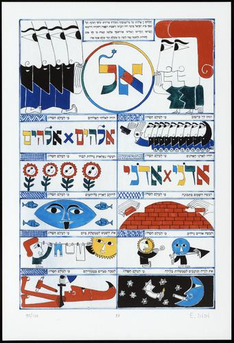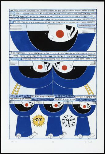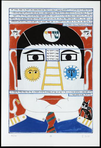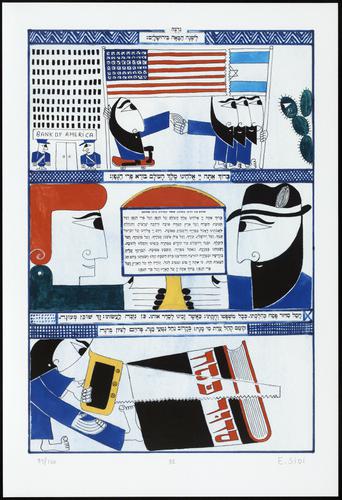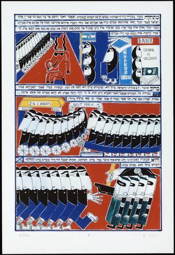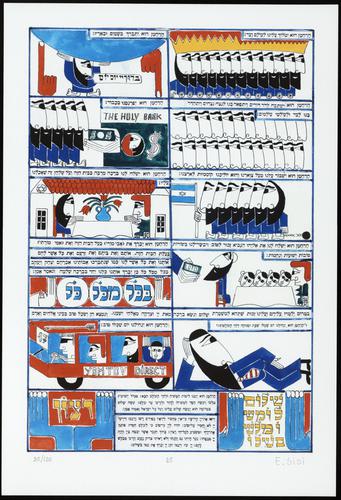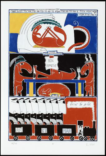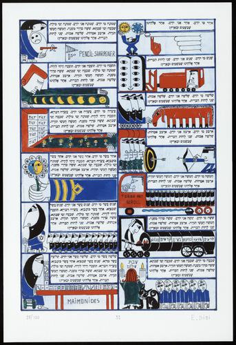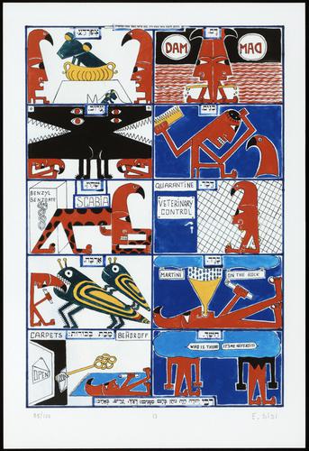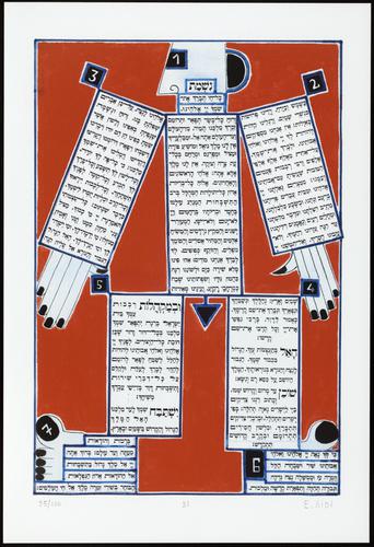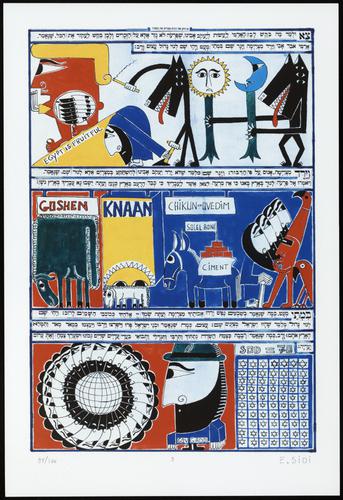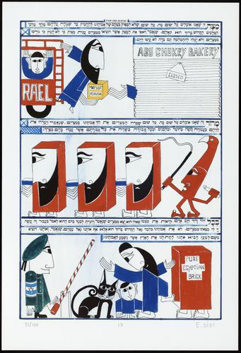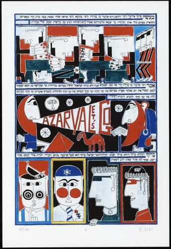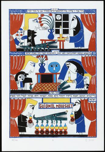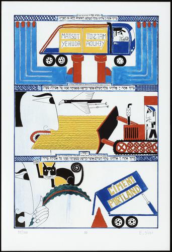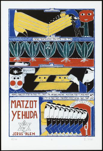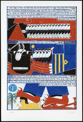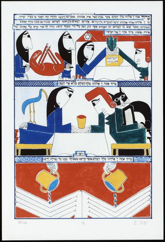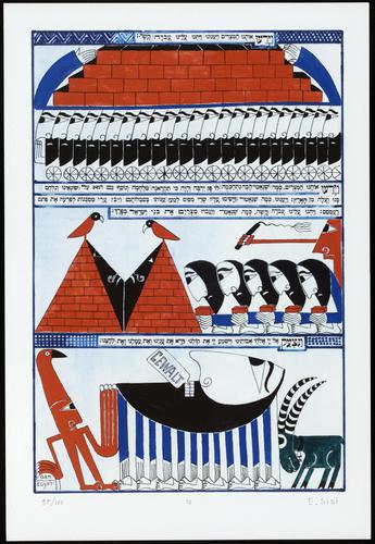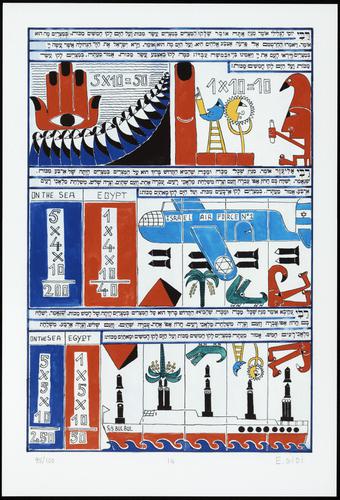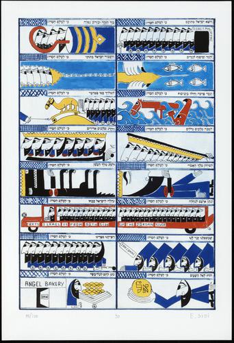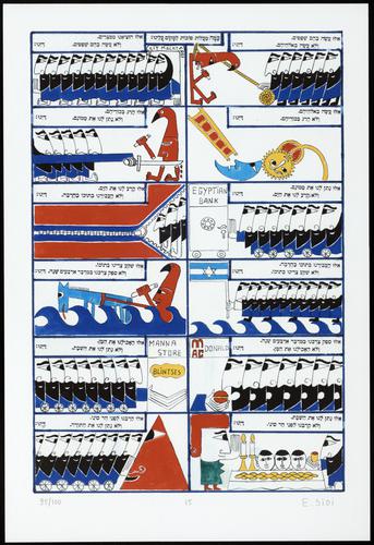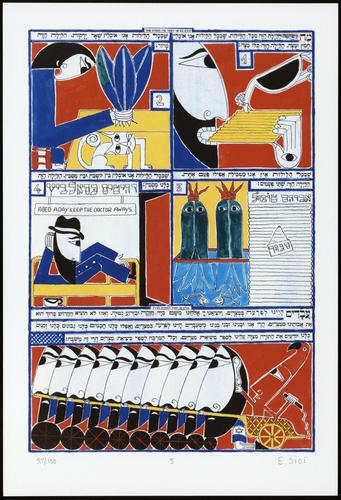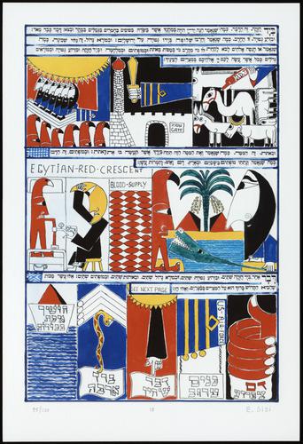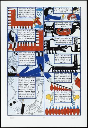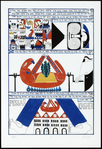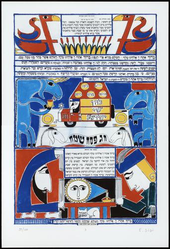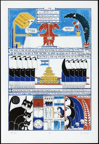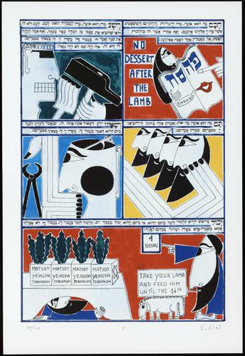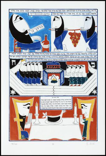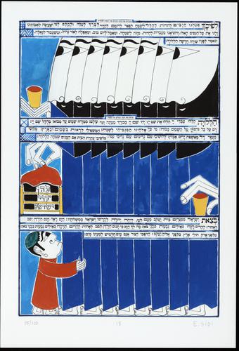 Hagada in houten kistje met beschilderd deksel; 34 losse pagina's in kleur en een zwartwit boekje met toelichting op de afbeeldingen.