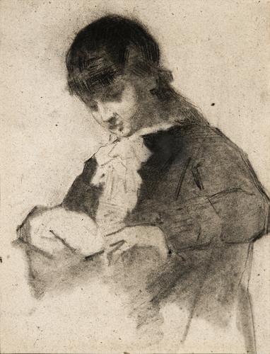 Vrouw met witte muts en cape ten voeten uit staande. Op de achterzijde een kleine tekening van een naaistertje in zwarte jurk met paardestaart en witte strik.