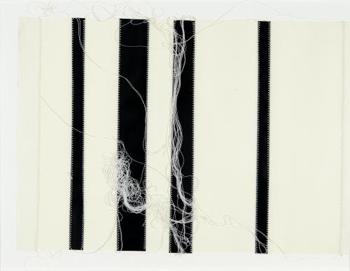 aan elkaar genaaide banen zwart en wit papier met over het oppervlak gedrapeerde witte getwijnde draden.
